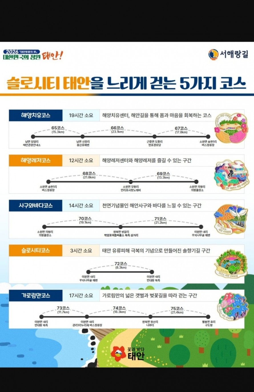 안녕하세요!서해랑길 태안구간 신청합니다.태안군에서 서해랑길 태안 배지투어 참가자를 약 300명정도 선출하였습니다.각각 알아서 걷고, 후기제출하는 타입으로, 수요가 있을것으로 봅니다!!4월부터해서 몇코스만이라도 진행해주시면 정말좋을것같습니다!!서해랑길 65~75코스 걷기를 희망합니다~~!외씨버선길처럼 매주 1~2코스씩 걷는 투어를 만들면 좋을것같다는 생각이 들어 신청해봅니다.