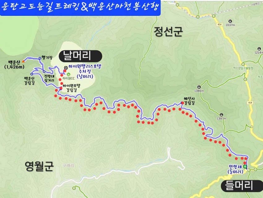 만항재 ~ 임도 ~ 혜선사갈림길 ~ 차단기 ~ 갈림길에서 마운틴콘도 방향(오르막) ~ 백운산 마천봉(이정표) ~ 전망대 갈림길(마천봉왕복) ~ 하이원팰리스호텔 주차장
