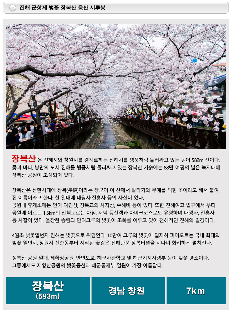 ▶B코스(7km/ 5시간) : 장복산조각공원 ~ 삼밀사 ~ 장복산(인증) ~ 덕주봉 ~ 안민고개 ~ 벚꽃길 ~ 경화역 |
