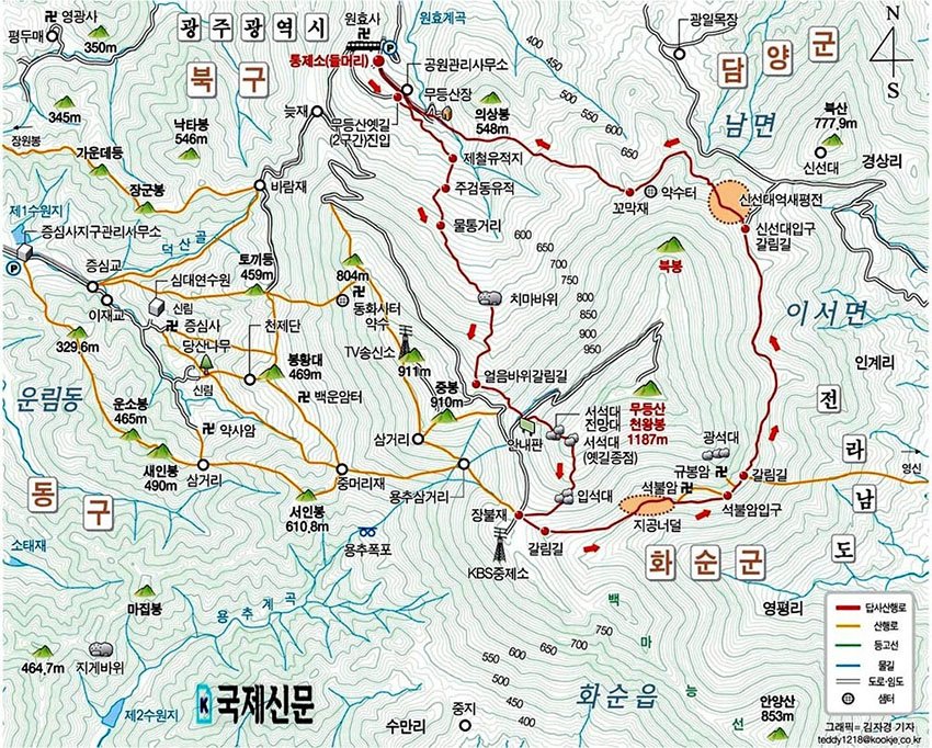 원효사주차장 ~ 원효광장 ~ 무등산옛길표지석 ~ 목교 ~ 서석대 ~ 인왕봉전망대(왕복 0.8km) ~ 서석대 ~ 입석대 ~ 장불재 ~ 규봉암 ~ 꼬막재 ~ 원효사주차장 ▶B코스(원점회귀) (약 9.3km/5시간) 원효사주차장 ~ 원효광장 ~ 무등산옛길표지석 ~ 목교 ~ 서석대 ~ 인왕봉전망대(왕복 0.8km) ~ 서석대 ~ 원효사주차장 원점회귀 |