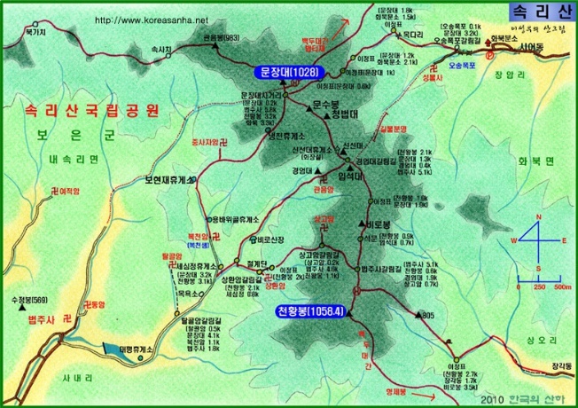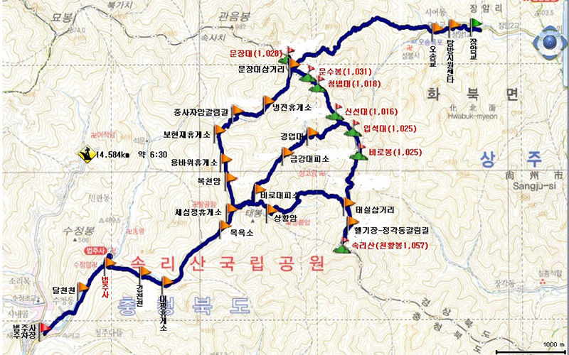 화북분소 ~ 문장대 ~ 신선대 ~ 입석대 ~ 천왕봉 ~ 법주사 ~ 주차장 ▶ 초보자코스 (약 10km/ 5시간) 화북분소 ~ 문장대 ~ 법주사 ~ 대형주차장 |
