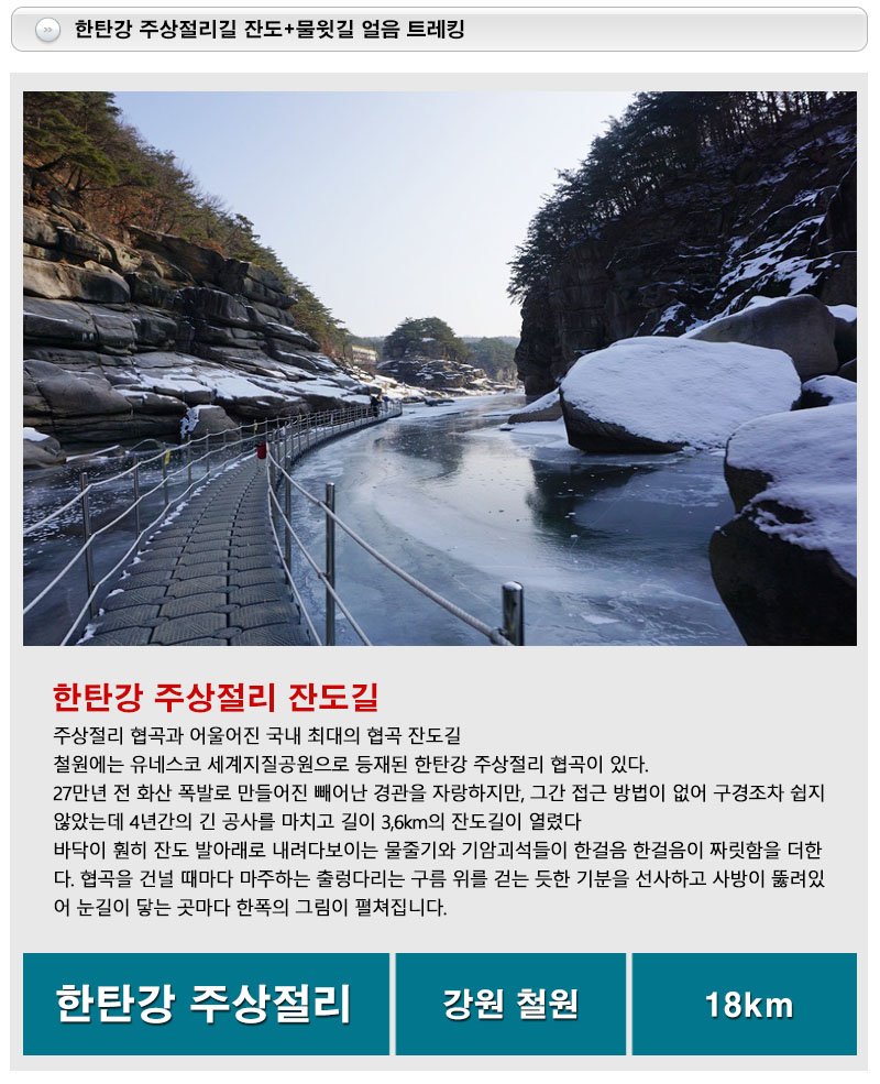 - 한탄강주상절리길 : 개인 10,000원(단체 8,000원) -> 지역상품권 5,000원(단체 4,000원) 증정 - 물윗길 : 개인 10,000원(단체 8,000원) -> 지역상품권 5,000원(단체 4,000원) 증정 한탄강 주상절리길 잔도 + 물윗길 얼음 트레킹 (약18km/6시간30분)