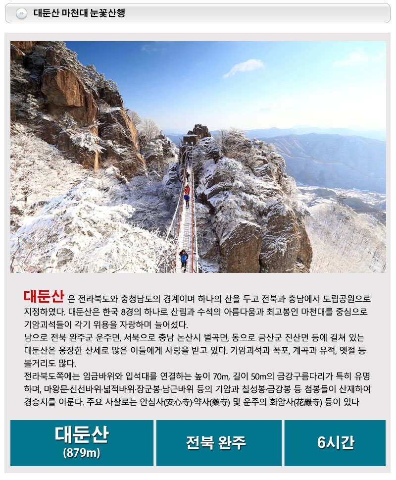 | ·산행준비물 | 겨울철 산행기본복장, 마스크, 방한복, 방풍의, 랜턴, 스틱, 아이젠, 스패츠, 모자, 장갑, 구급약품, 식사개인준비, 여벌옷 등 |