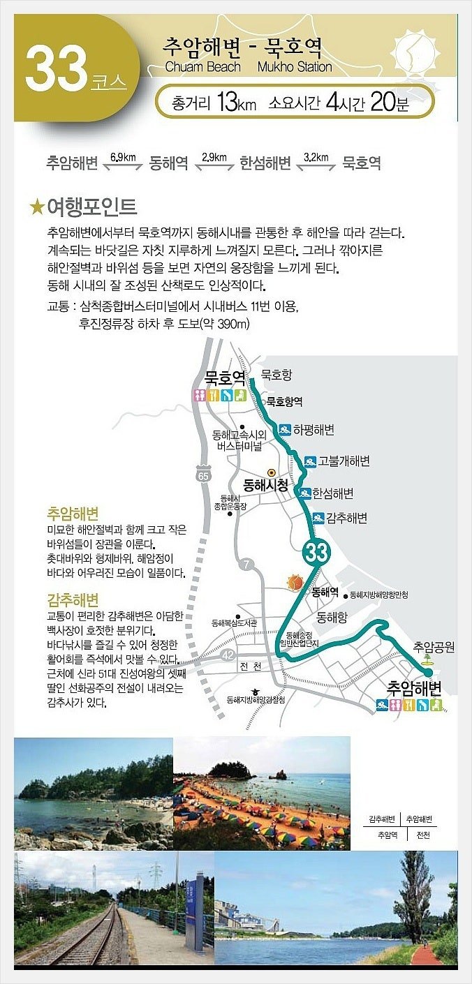 전후 산행시작. 해파랑길 - 33코스 (약 13.6km/ 4시간30분) 추암역 ~ 동해역 ~ 한섬해변입구 ~ 묵호역 입구 * 스템프QR위치 - 시점: 강원도 동해시 추암동 468-1 (추암역 오징어해우소 옆) - 종점: 강원도 동해시 발한동 37-7 (묵호역 뒤쪽 향로봉길 입구) |