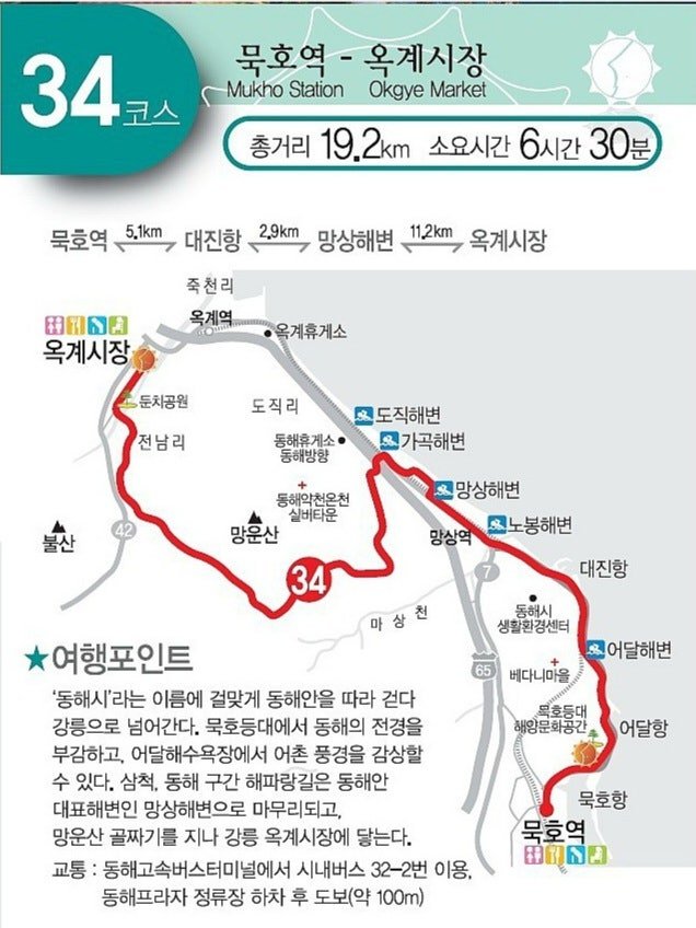 전후 산행시작. 해파랑길 - 34코스 (약 14.5km/ 5시간) 묵호역 입구 ~ 묵호등대공원 ~ 대진항 ~ 망상해변 ~ 한국여성수련원입구 * 스템프QR위치 - 시점 : 강원도 동해시 발한동 37-7 (묵호역 뒤쪽 향로봉길 입구) - 종점: 강원도 강릉시 옥계면 금진리 산105-8 (한국여성수련원 입구) |