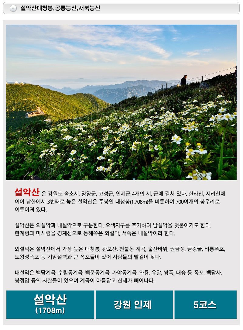 한계령휴게소~한계령삼거리(인증)~끝청(인증)~중청~(대청봉 왕복 1.2km)~희운각대피소~공룡능선~마등령삼거리(인증)~비선대~설악동탐방지원센터 (국립공원 스탬프투어 인증)~소공원주차장~(약 2.5km, 시내버스)~설악동C지구 상가지역(청봉식당.전주식당) ▶ B코스 (약 20km/ 10시간) 한계령휴게소~한계령삼거리(인증)~끝청(인증)~중청~(대청봉 왕복 1.2km)~희운각대피소~천불동~설악동탐방지원센터 (국립공원 스탬프투어 인증)소공원주차장~(약 2.5km, 시내버스)~설악동C지구 상가지역(청봉식당.전주식당) * A, B코스 대청봉 인증 받으실 분 대청봉 왕복 1.2km다녀오세요. ▶ C코스 (약 20km/ 11시간) 오색/남설악탐방지원센터~대청봉(인증)~희운각대피소~공룡능선~마등령(인증)~설악동탐방지원센터 (국립공원 스탬프투어 인증)~소공원주차장~(약 2.5km, 시내버스)~설악동C지구 상가지역(청봉식당.전주식당) ▶ D코스 (약 17km/ 9시간) 오색/남설악탐방지원센터~대청봉(인증)~희운각대피소~천불동~설악동탐방지원센터 (국립공원 스탬프투어 인증소공원주차장~(약 2.5km, 시내버스)~설악동C지구 상가지역(청봉식당.전주식당) * A~D 코스 희운각대피소에서 공룡능선으로 가실지 천불동으로 내려가실지 결정하세요. ▶ E코스 (약 23.1km/ 12시간) 한계령휴게소~끝청(인증)~중청~(대청봉 왕복 1.2km)~소청~희운각대피소~공룡능선~마등령~오세암~영시암~백담사~(셔틀버스)~용대리 시외버스정류장 ▶ F코스 (약 21.95km/ 12시간) 한계령휴게소~끝청(인증)~중청~(대청봉 왕복 1.2km)~소청~봉정암~오세암~영시암~백담사~(셔틀버스)~용대리 시외버스정류장 ▶ G코스 (약 18.5km/ 10시간) 한계령휴게소~한계령삼거리(인증)~귀때기청봉(인증)~대승령~십이선녀탕계곡~남교리지킴터~신의주순대국밥 앞 ▶ H코스 (공룡능선. 약 20km/ 12시간) 소공원~비선대~마등령~공룡능선-무너미고개~천불동계곡~양폭대피소~비선대~소공원~소공원주차장~(약 2.5km, 시내버스)~설악동C지구 상가지역(청봉식당.전주식당) |