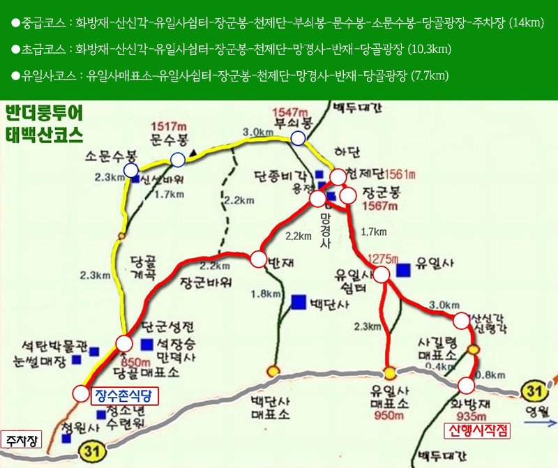 화방재(유일사주차장) ~ 유일사갈림길 ~ 주목군락지 ~ 장군봉 ~ 천제단 ~ 망경사 ~ 당골광장 ~ 장수촌식당(합류)