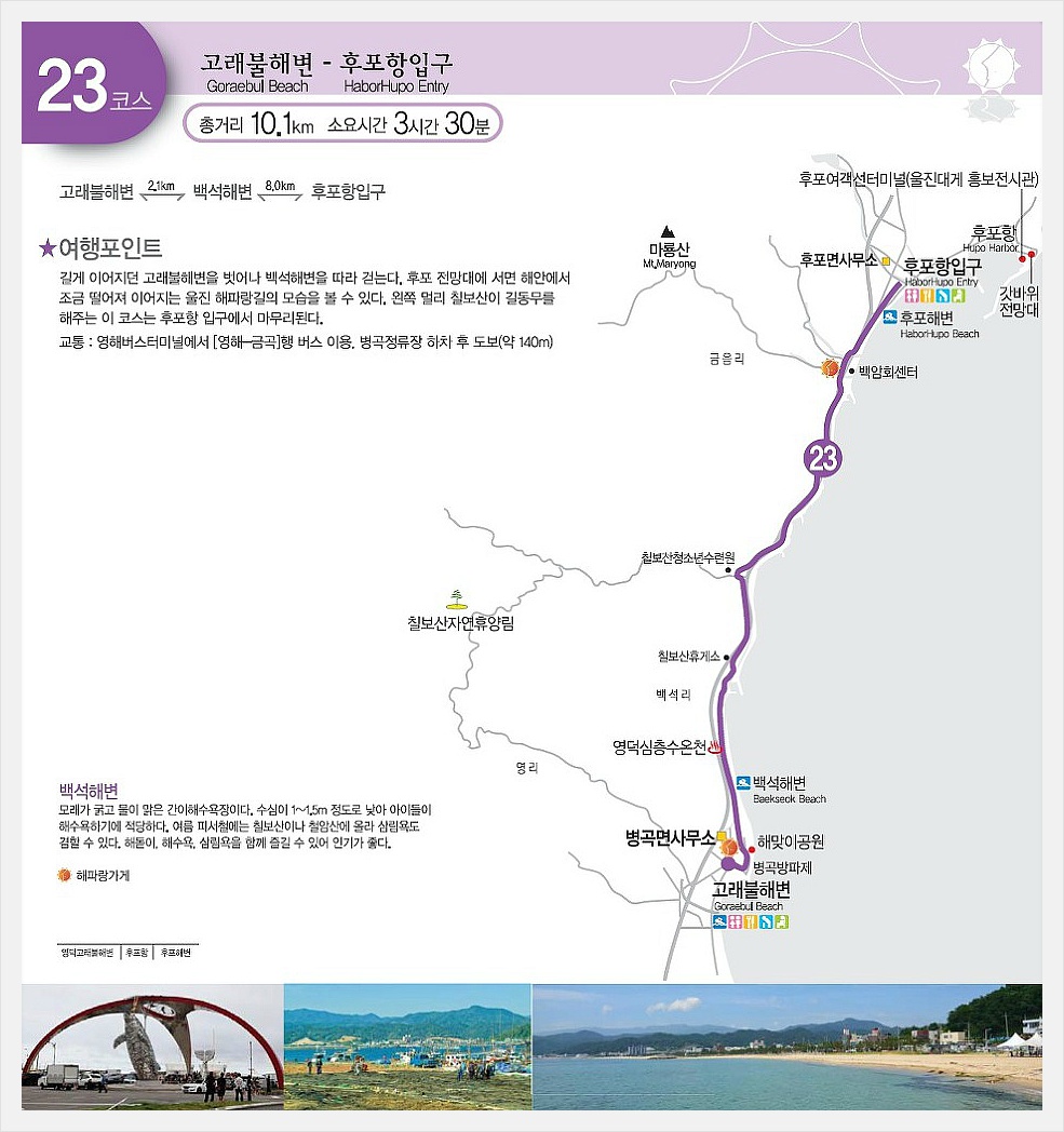 전후 산행시작. 해파랑길 - 23코스 (약 10.1km/ 4시간) 고래불해변 ~ 백석해변 ~ 후포항 * 스템프QR위치 - 시점: 경상북도 영덕군 병곡면 병곡리 58-30 (고래불해변 주차장) - 종점: 경상북도 울진군 후포면 후포리 316-25 (후포항 공중화장실 입구) |