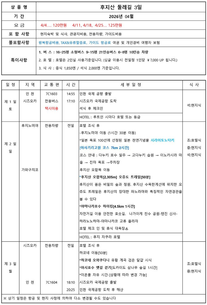 · 본 일정은 탐방로/도로 통제시 산행지가 변경될 수 있습니다.