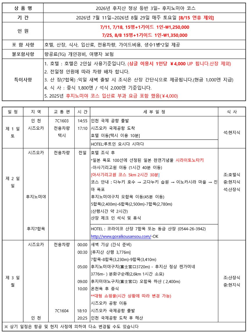 · 산행지 변경으로 인한 환불 요청은 불가합니다. (예약 취소는 기존 취소 규정을 따릅니다.)