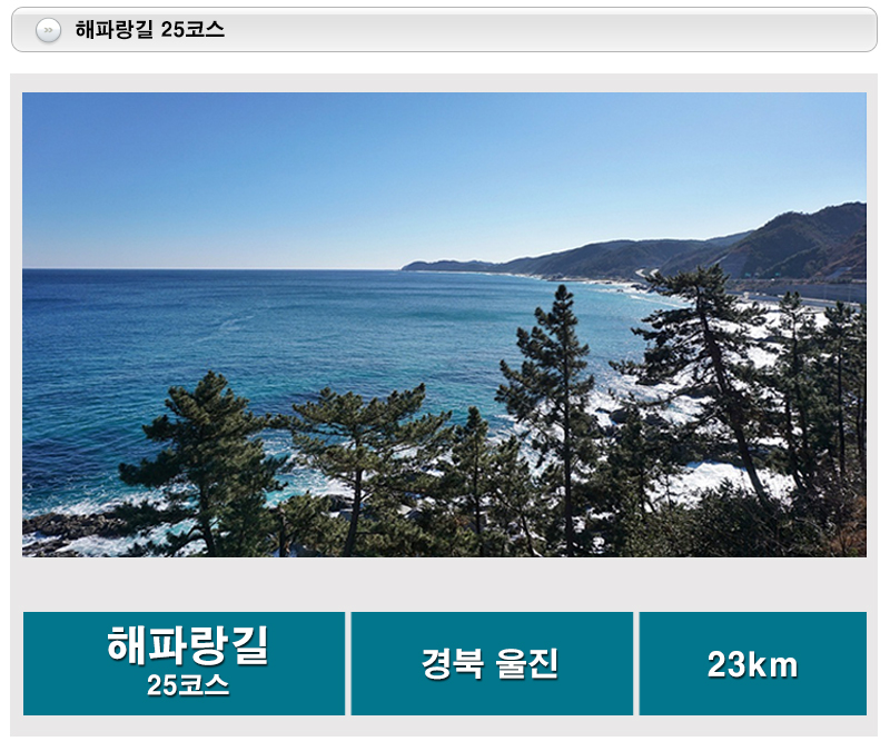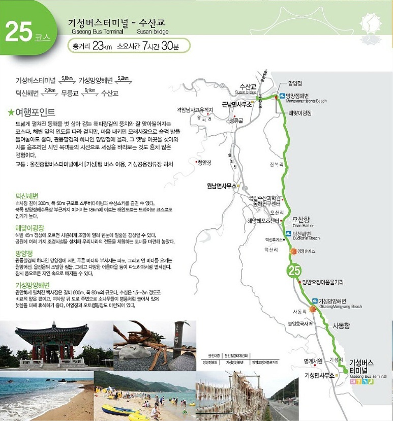 전후 산행시작. 해파랑길 - 25코스 (약 23km/ 5시간30분) 기성터미널 ~ 수산교 * 스템프QR위치 - 시점: 경상북도 울진군 기성면 척산리 86-1 (기성공용정류장 옆) - 종점: 경상북도 울진군 근남면 노음리 322-11 (수산교 남쪽) |