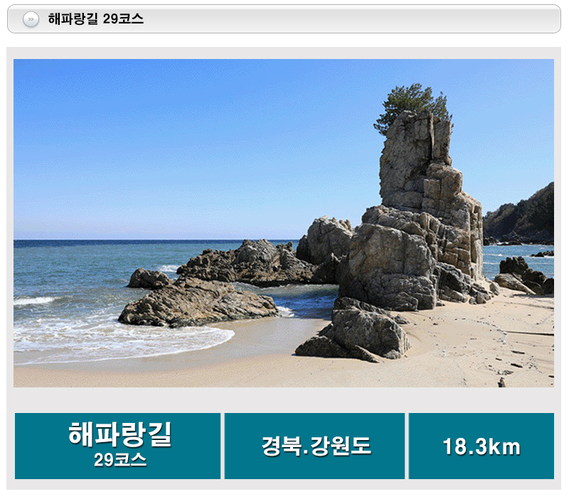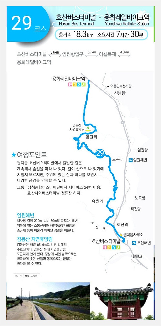 전후 산행시작. 해파랑길 - 29코스 (약 18.3km/ 7시간) 호산터미널 ~ 임원항 ~ 아칠목재 ~ 용화레일바이크역 * 스템프QR위치 - 시점: 강원도 삼척시 원덕읍 호산리 187-9 (호산버스정류장 앞) - 종점: 강원도 삼척시 근덕면 용화리 169-2 (장호초등학교 정문 건너편) |