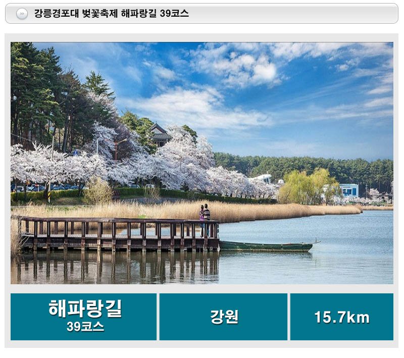 전후 산행시작. ▶해파랑길 - 39코스 (약 15.7km/ 5시간30분) 솔바람다리 ~ 허균.허난설헌기념관 ~ 경포대 ~ 사천진리해변공원 * 스템프QR위치 - 시점: 강원도 강릉시 남항진동 1-4 (솔바람다리 남측) - 종점: 강원도 강릉시 사천면 사천진리 2-75 (사천진해변 남쪽) ▶경포대 벚꽃 자유관광 |