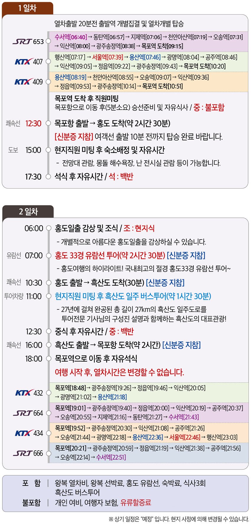 | ·포함내역 | 왕복 열차비, 왕복 선박료, 홍도유람선, 숙박료, 식사3회, 흑산도 버스투어 |