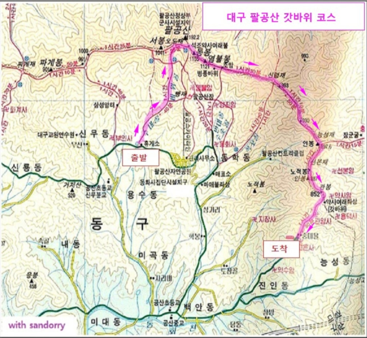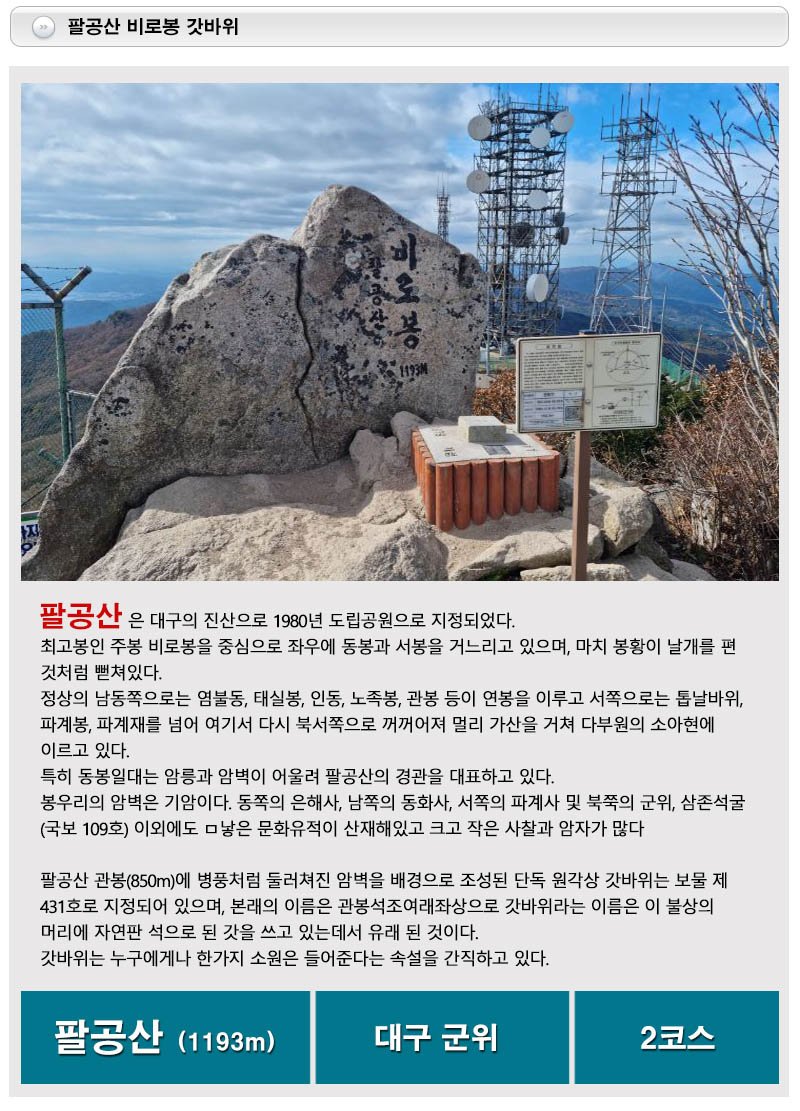수태골주차장 ~ 수태골 ~ 비로봉(인증) ~ 동봉 ~ 신령재 ~ 능성재 ~ 갓바위 ~ 갓바위주차장(대구방향) ▶단축코스 (약 9.0km/5시간30분+자유시간) 수태골주차장 ~ 수태골 ~ 비로봉(인증) ~ 동봉 ~ 74번 이정표(우틀) ~ 염불암 ~ 양진암 ~ 동화사 ~ 팔공산 자동차극장(씨네80)주차장 |