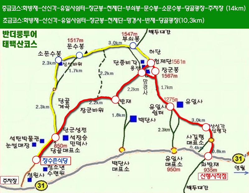 화방재 (유일사 주차장) < 태백산 장군봉. 새해일출산행 > 화방재(유일사주차장) ~ 유일사갈림길 ~ 주목군락지 ~ 장군봉 ~ 천제단 ~ 망경사 ~ 당골광장 ~ 장수촌식당(합류) |