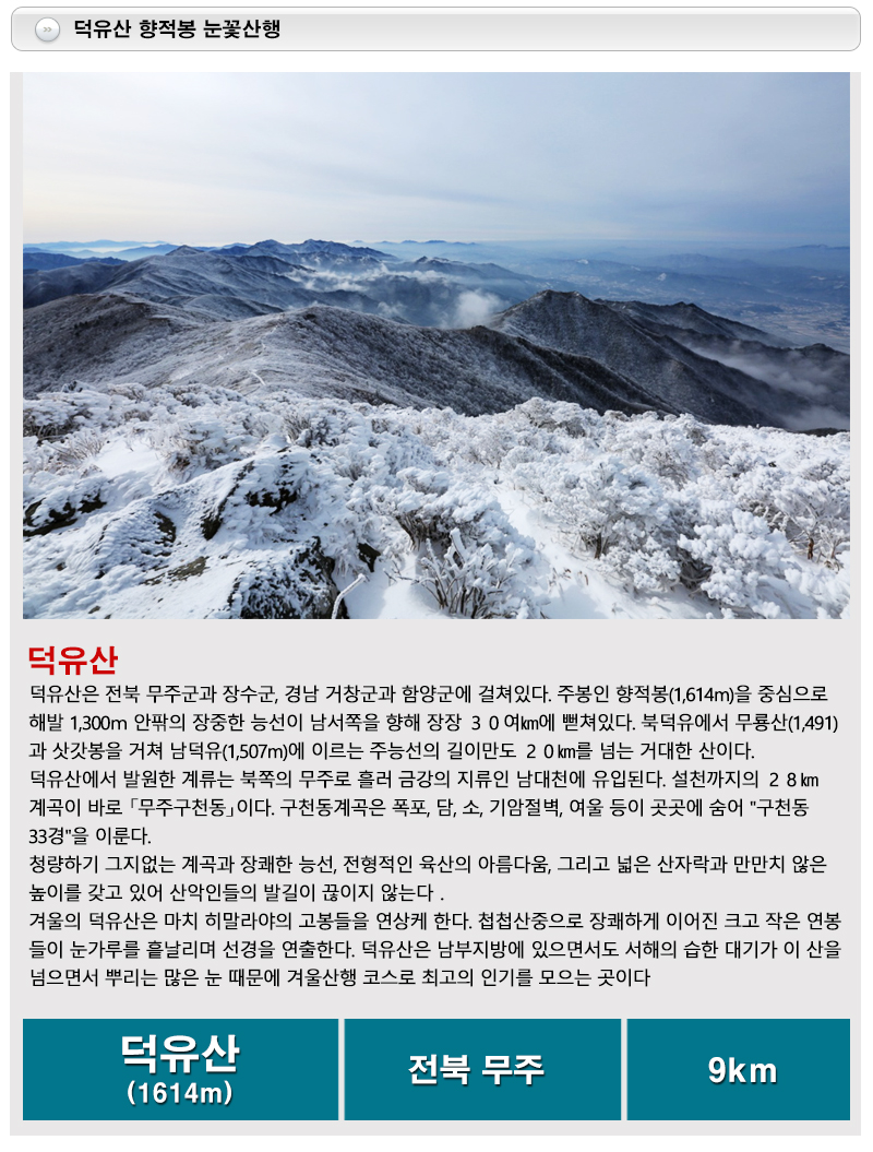 전후 산행시작 ※ 곤도라는 산악회에서 예약해드립니다. (곤도라비용 = 편도:20,000원, 왕복:25,000원 당일 버스에서 부탁드립니다) 덕유산 향적봉 눈꽃산행 (약9km/ 6시간)