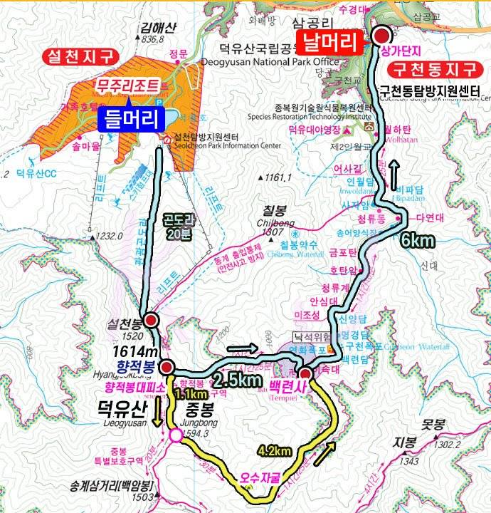 1.곤도라이용 ~ 설천봉 ~ 향적봉 ~ 대피소 ~ 백련사 ~ 무주구천동 ~ 삼공리주차장(6시간)