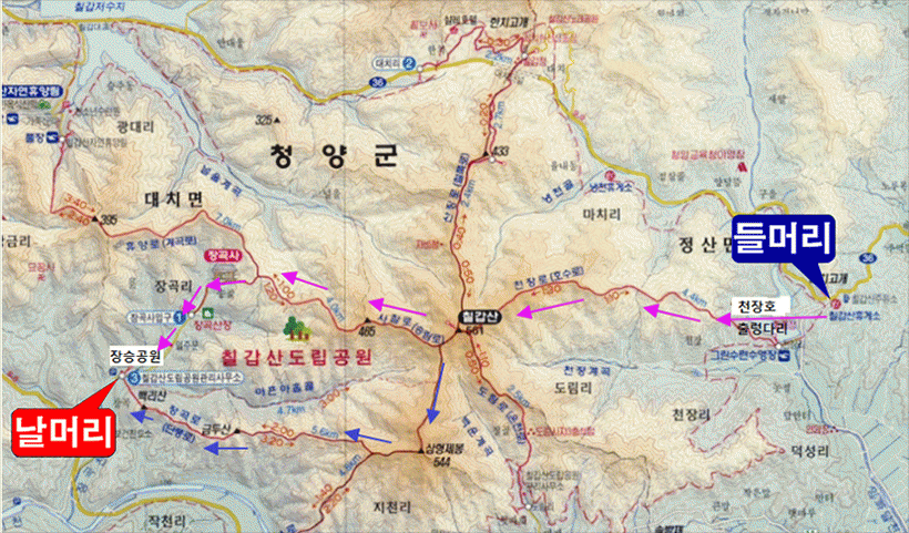 천장지주차장 ~ 천장호출렁다리 ~ 칠갑산 정상(인증) ~ 사찰로 ~ 장곡사 ~ 칠갑산 장승공원 ~ 장곡주차장 ▶B코스 (약 9.2km/ 5시간) 천장지주차장 ~ 천장호출렁다리 ~ 칠갑산 정상(인증) ~ 삼형제봉 ~ 칠갑산 장승공원 ~ 장곡주차장 |