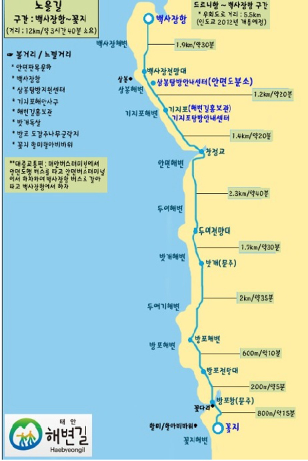 ▶ 태안해변길 트레킹 (6km/3시간) 삼봉해변 ~ 안면해변 ~ 방포해변 ~ 꽃지해수욕장 (국립공원스탬프투어) |