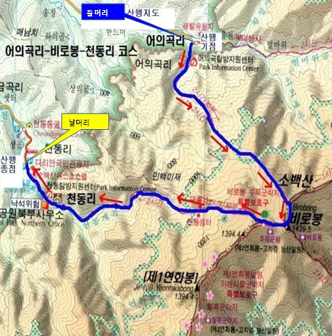 어의곡주차장 / 어의곡탐방지원센터 (국립공원 스탬프투어 인증) ~ 어의곡갈림길 ~ 소백산 비로봉 정상 (인증) ~ 천동쉼터 ~ 다리안폭포 ~ 천동탐방안내소 (국립공원 스탬프투어 인증) ~ 다리안관광지 주차장