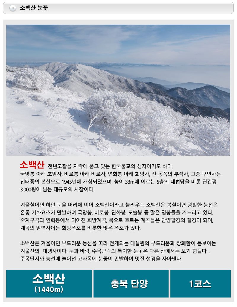 | ·산행준비물 | 겨울철 산행기본복장, 마스크, 방한복, 방풍의, 랜턴, 스틱, 아이젠, 스패츠, 모자, 장갑, 구급약품, 식사개인준비, 여벌옷 등 |