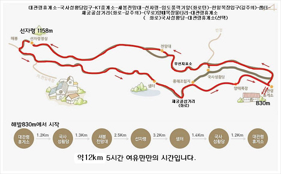 대관령마을휴게소 주차장 ~ KT송신소 ~ 전망대 ~ 선자령 ~ 재궁골삼거리 ~ 봉해조림지 ~ 양떼목장 ~ 대관령마을휴게소 주차장