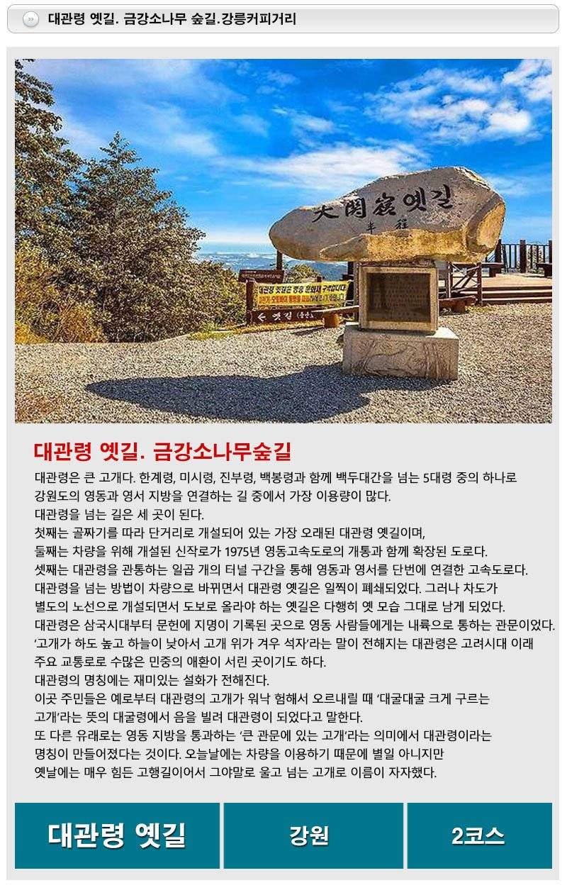 반정 ~ 대관령옛길 ~ 주막 ~ 계곡길 ~ 오솔길 ~ 숯가마 ~ 금강송정 ~ 대통령쉼터 ~ 전망대 ~ 풍옥대 ~ 노루목이 ~ 솔고개입구 ~ 솔숲교 ~ 어흘리주차장 ▶B코스 (약 7km/4시간) 삼포암주차장 ~ 삼포암폭포입구 ~ 삼포암폭포 ~ 금바위 ~ 목교 ~ 한쉼터 ~ 노루목이 ~ 다래터 ~ 대통령쉼터 ~ 도둑재 ~ 풍욕터 ~ 전망대 ~ 쉼터 ~ 숯가마 ~ 한쉼터 ~ 목교 ~ 삼포암폭포 ~ 삼포암주차장 ~ 어흘리주차장 |