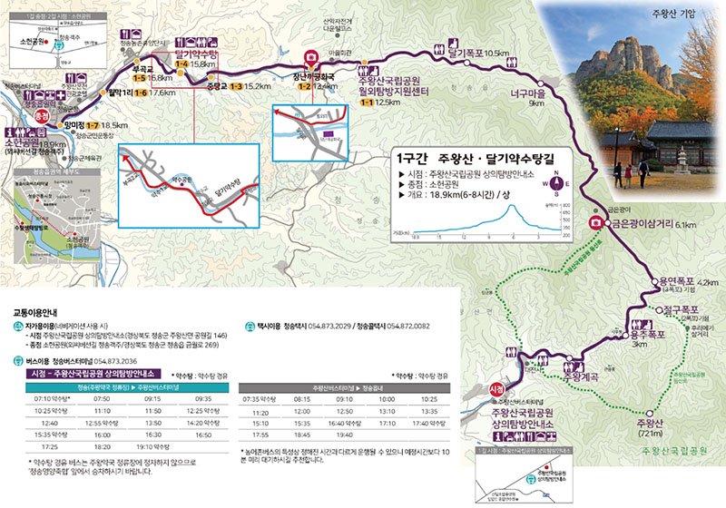 상의주차장 도착 (경북 청송군 부동면 공원길 146) 외씨버선길 1길 - 주왕산 달기약수탕길 (19km/6시간40분) 상의주차장 ~ 주왕산국립공원 탐방안내센터 (국립공원 스탬프투어 인증) ~ 주왕계곡 ~ 용추폭포 ~ 절구폭포 ~ 용연폭포 ~ 금은광이 삼거리 ~ 너구마을 ~ 달기폭포 ~ 주왕산 국립공원월외공원지킴터 ~ 장난끼공화국 ~ 중탕교 ~ 달기약수탕 ~ 부곡교 ~ 월막1리 ~ 망미정 ~ 소헌공원/ 외씨버선길 청송객주 |