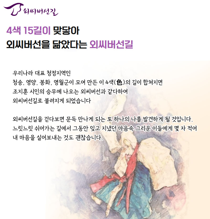 고현지 도착 (경북 청송군 진보면 시량리 184-2 시량2리(송이곡) 버스정류소) 외씨버선길 4길 - 장계향디미방길 (19.15km/6시간30분) 고현지 ~ 지경리마을~ 두들마을~ 옥계1리마을~ 옥계지~ 임도삼거리~ 입암면사무소~ 선바위관광지 |