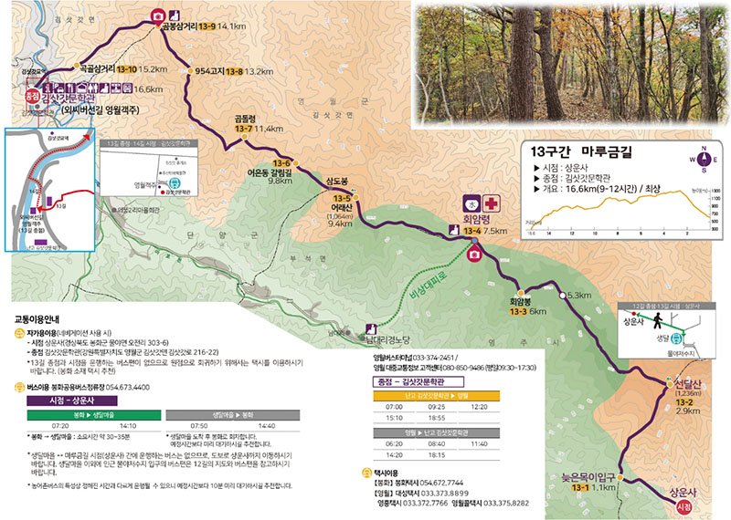 상운사 도착 (경상북도 봉화군 물야면 오전리 303-6 주변 ) 외씨버선길 13길 - 마루금길 (16.6km/7시간30분) 상운사~ 늦은목이 옹달샘~ 선달산~ 어래산~ 곱돌령~ 김삿갓문학관 |