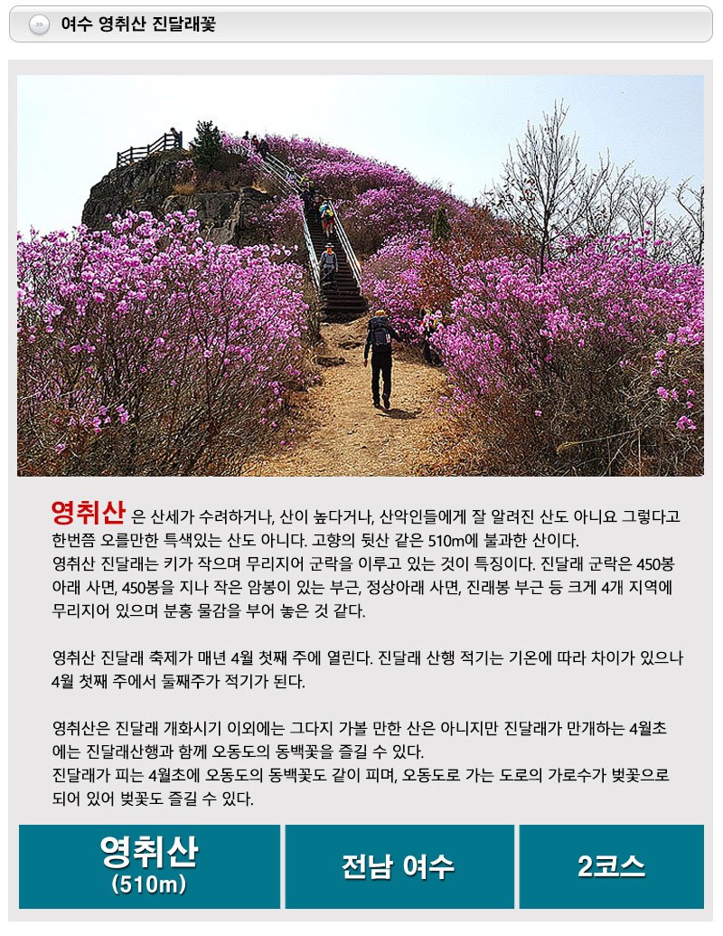 돌고개주차장 도착 (전남 여수시 월내동 548 돌고개주차장) < 영취산 진달래축제 > ▶A코스(약 5.4km/3시간+자유시간) : 돌고개주차장-포장도로-가마봉-영취산 정상(진례봉 인증)-봉우재-흥국사-중흥 흥국사주차장 ▶B코스 (약 6.7km/5시간) : 돌고개주차장-포장도로-가마봉-영취산 정상(진례봉 인증)-봉우재-시루봉-흥국사-중흥 흥국사주차장 |