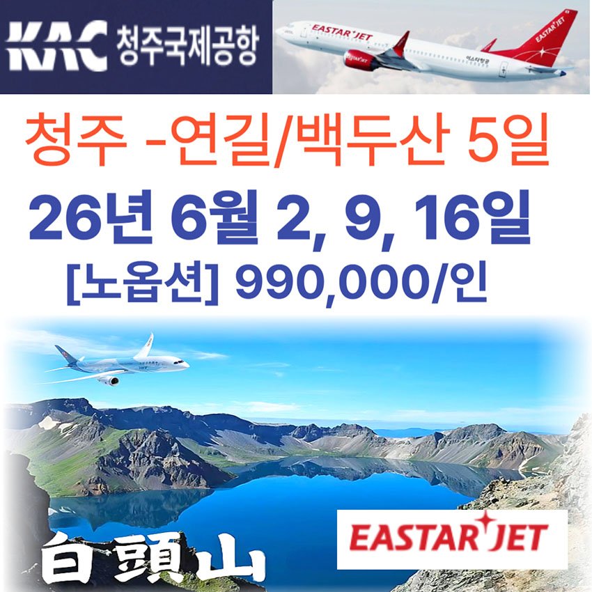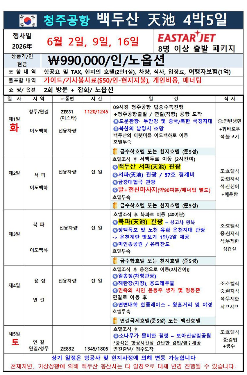 [청주-연길] 백두산 북파+서파+윤동주생가 4박5일